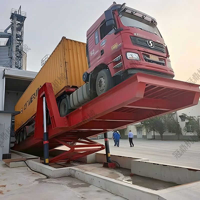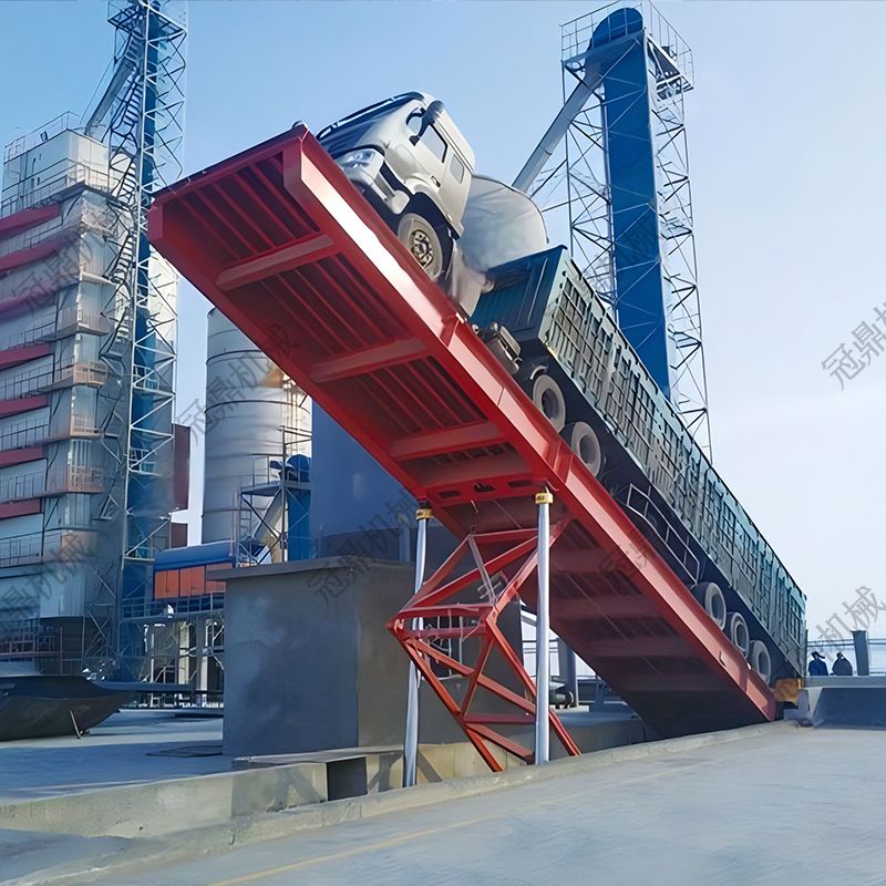 后翻式卸車機是一種高效裝卸設(shè)備,通過夾緊裝置將整車固定在平臺上,啟動傾斜裝置后將卡車整體抬高至45°的傾斜角度,利用貨物重力自然滑落完成卸貨。裝卸完成后,平臺恢復(fù)水平狀態(tài),卡車安全駛離。該設(shè)備操作便捷、安全可靠,廣泛應(yīng)用于散裝貨物運輸領(lǐng)域。